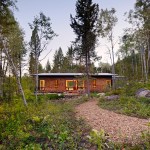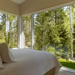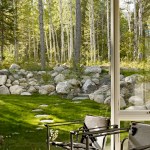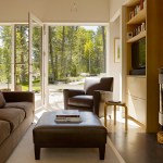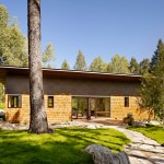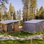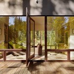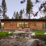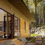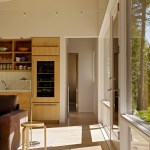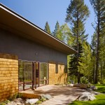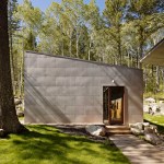 This 990 square foot guesthouse is the first phase of a master plan for a 5-acre sloping wooded property owned by the architect and his wife in Jackson Hole, Wyoming. The design was intended to immerse the owners in the experience of the forest both visually and aurally. Through its siting near a stream that provides the sound of rushing water, and large windows that open the intimately scaled rooms to the outside, the house creates the feeling of actually being in the woods. In keeping with its setting and a reductive sensibility, the house is a simple rectangle oriented on an east-west axis that meditates between the forest on three sides and the stream and a clearing to the north. A detached garage set among a stand of mature fir trees completes the composition. Within the compact plan limited by zoning to 1,000 square feet, are a bedroom and bath at the east and west ends of the house separated by a glass-enclosed central living room containing a small, but fully equipped galley kitchen.