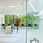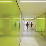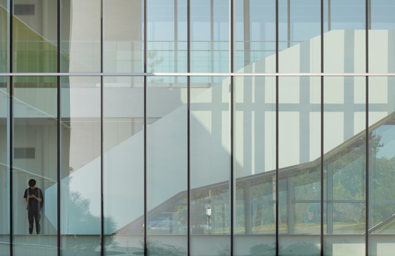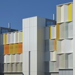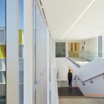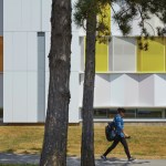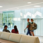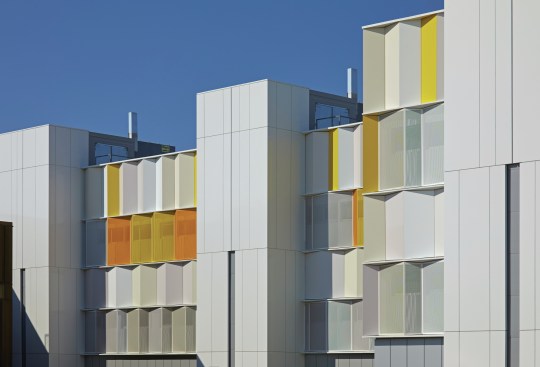 Gow Hastings began by shedding the building’s dark brown aluminum envelope back to its steel frame, and recladding it with alpolic aluminum panels – a readily available and lightweight material conventionally found on gas stations that instantly gives the building a clean and luminous appearance. The College worked closely with the design team to choose the white and yellow panels that transform the facade while suitably integrating it with the original brown campus buildings and a new Corten-clad neighbour. By arranging the similarly coloured panels at varying angles, there was an opportunity to capture natural light in different conditions, giving the illusion of a deeper colour palette. To break down the A-Wing’s solidity, the architects re-crafted its form by applying some panels with “accordion folds”, and adding perforated versions over the windows. The overall effect is uplifting and playful.