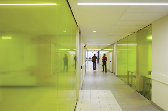 To enhance the building’s circulation patterns, Gow Hastings adjusted external entrances to respond to the most commonly used pathways, and straighted corridors that create intuitive and accessible spaces within. The architects applied their expertise in hands-on learning environments to create classrooms for both the Health and Wellness, and Justice and Community Development programs that simulate contemporary hospitals, ambulances, and courtrooms with extras such as technologies that support teaching scenarios. Overall the revamped building