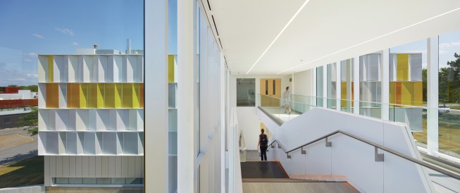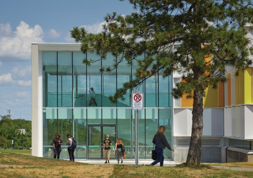 So the team got to work, stripping the 76,000-square-foot building—originally designed by Canadian Modernist architect Ronald Thom with Thompson, Berwick, Pratt and Partners in 1973—down to its steel structure and beginning anew. In creative collaboration with Fleming College, the firm devised a façade of yellow and white Alpolic aluminum panels, commonly used in gas station construction. Arranged in an accordion-like pattern with some perforated versions over windows as solar shading, the metal panels catch sunlight and cast shadows on themselves, creating a playful effect. Entrances and circulation spaces are visible on the exterior as glass pavilions, which also allow sunlight into the building. A circulation atrium, meanwhile, continues this effort.