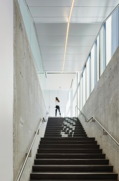 To bring physical lightness into the building, Gow Hastings demarcated each entrance and key circulation space with a glass pavilion and added a transparent central hub that serves as a meeting space for socializing and informal learning. This node also includes a skylight that draws light downwards over multiple storeys. Replacing solid classroom and office walls with glazing, the design invites light to further pervade the interior, while also treating passerbys to glimpses of the learning taking place within. Supporting Fleming College’s goal of improving its energy efficiency, the design team outfitted the A-Wing with a variety of performance upgrades including new roofing, energy efficient glazing, LED light fixtures with occupancy sensors, and building components made of recycled materials.