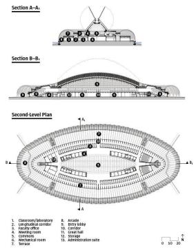 The IST is a 162,000-square-foot, oval-shaped, two-story building that