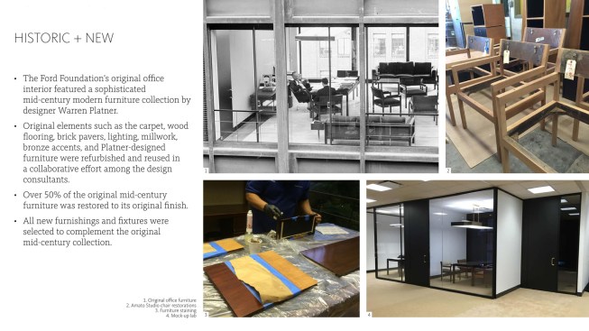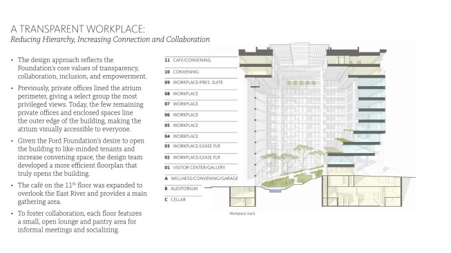David Briefel, sustainability director: Ford Foundation’s core values are focused on the idea of being transparent and inclusive. That was informing some of these decisions to move toward the egalitarian side of planning, which by its very nature helps us with all of the environmental and sustainable features, from health and access to daylight to more efficient energy planning.