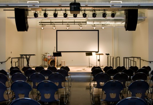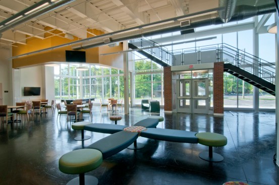 To meet the challenges of rapid growth, Forest Hills Baptist Church looked to HFR Design for master planning, architectural, and engineering services.The Forest Hills Student Center features classroom and youth space. Design solutions achieved by HFR include 3 large garage doors on each of the two assembly rooms, which allow expanded event space for the church. Above the garage doors, perforated metal panels were put in place to allow banners and other marketing and event materials to easily be displayed.