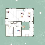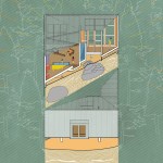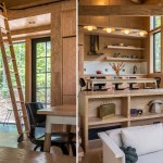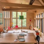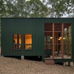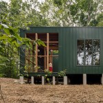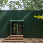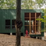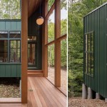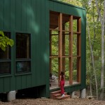 The house’s moss green–painted exterior also blends thoughtfully with the surrounding maple, birch, and elm trees, simultaneously complementing its vegetative surroundings while distinguishing itself from the building’s lighter-toned, airy interior. Often washed with daylight thanks to ample large windows, light-colored wood accentuates the gradients between different rooms otherwise unobstructed by walls; a sunken living area rests a step beneath the dining room and kitchen, all of which sit under a lofted sleeping space.