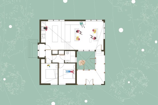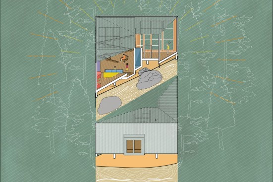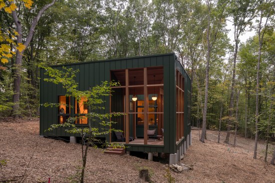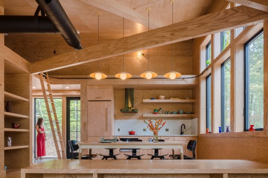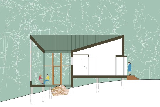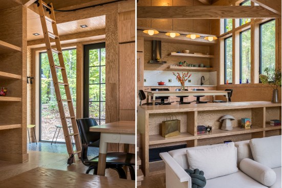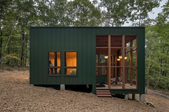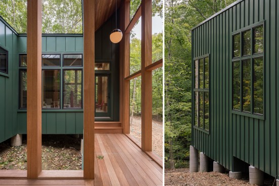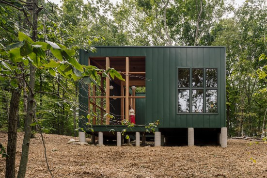 In 2021, when the New York firm Scalar Architecture began designing a 1,200-square-foot residence in Litchfield County, Conn., a boulder sat in the center of the project’s site. Surrounded on all sides by evergreen and deciduous trees, the large, moss-covered rock became a natural focal point for Scalar as the firm worked on the Forest Retreat, a cabin for a family of writers and producers seeking a quiet refuge. While Scalar developed schemes in the early planning stages, several of which relied on a more traditional porch to bridge interior and exterior space, site visits revealed the obvious: The boulder, placed squarely in the middle of the house’s potential locale, would ultimately dictate the final design.