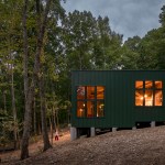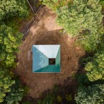 While area-specific considerations inform many an architectural project, the qualities of the Forest Retreat’s location played a significant role in its design. A slight slope required the firm to use piers that make the structure seemingly hover above the forest bed below, masking the gradual downward slope that gives the cabin’s interior a gentle, spiraling quality.