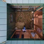 But the boulder remained the focal point, anchoring an exposed, interior courtyard, or impluvium, that allowed the designers to bring more sunlight into the living spaces. The feature also facilitated an easy cross breeze through the structure, accommodating local airflow patterns such as heavy winter winds from the north and northeast and a summer southwestern wind. The impluvium—framed by an inward-sloping, four-segment, recycled-steel roof—also provided an open space for rain and snow to enter the topsoil below.