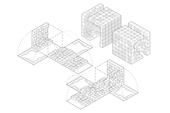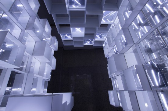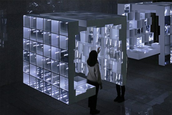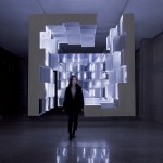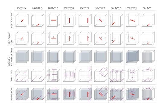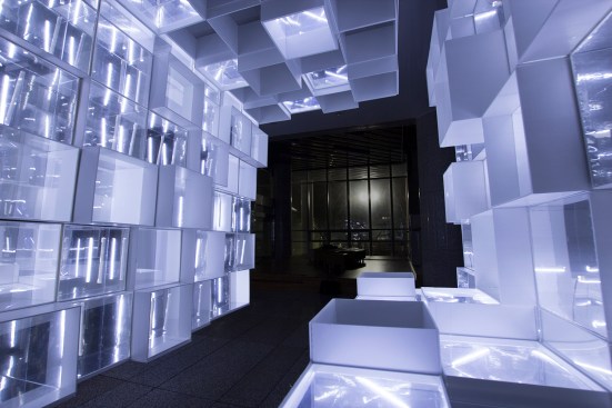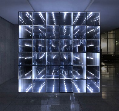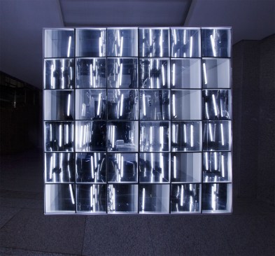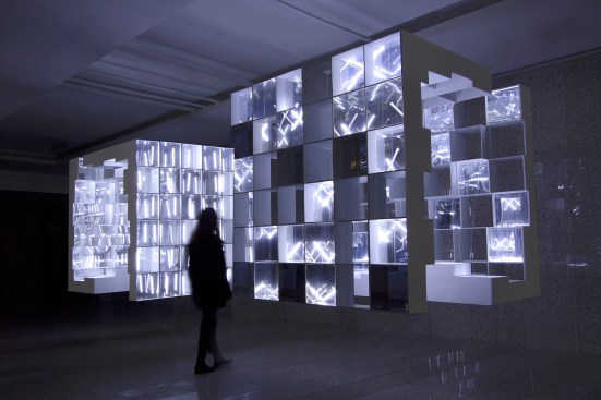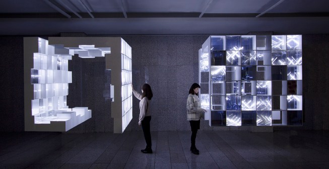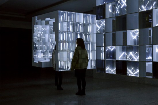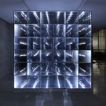 The work, constructed in the entrance exhibition hall of an engineering building at Pusan National University in South Korea, is a pair of floating hollow white cubes, each measuring 2.1 meters by 2.1 meters, is an assemblage of 216 individual modular units containing some without, white LED line lights with reflective inner housings and semi-reflective faces. Thirty-five centimeters by 35 centimeters square in profile, the units consist of 42 modular types with various enclosure depths, light alignments, inner housing configurations, and material applications.