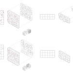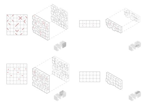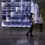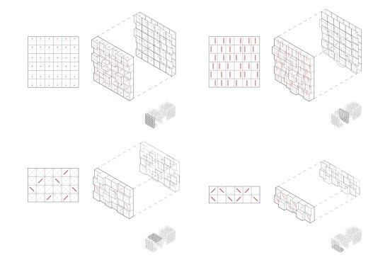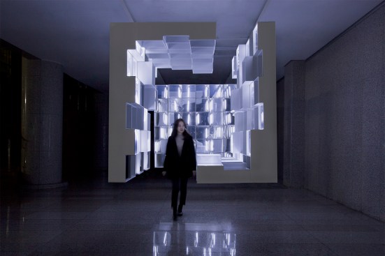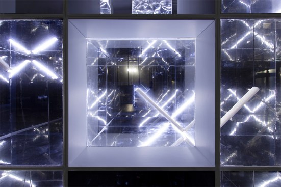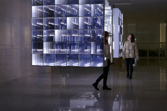 The assemblage of the modular units forms eight distinctive floating slabs, revealing various compositional schemes on the themes of symmetry and asymmetry, repetition and instance, rhythm and irregularity, and similarity and contrast. As one moves close to work, the viewer is presented with individually engageable framed openings, each offering optical readings with line light and reflection repeating in motion into the deep dark space.