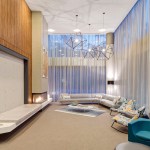 Intentionally keeping the majority of the overall interior architecture palette grounded in charcoal gray, walnut brown, white and black, key design features such as an outsize communal fireplace bench and the double story cobalt ceilinged art gallery have unexpected accents of color to keep the atmosphere feeling social and dynamic. Residents encounter surprises such as the “hidden” reception desk and sunshine-color, deeply upholstered work alcoves that line the interior route to the yoga lawn. Oversize modern cross-stitched rugs are used as wall hangings to acoustically soften concrete floor and glass-walled spaces and provide texture on 18’ high walls.