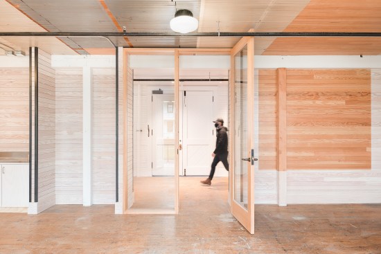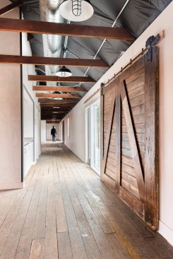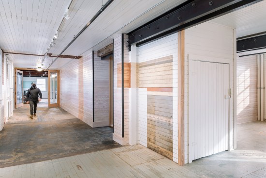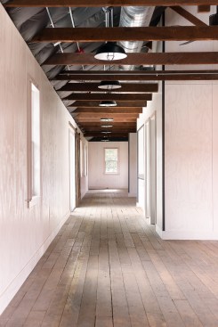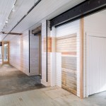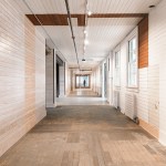 Located at the center of Makers Square is Building 305, also known as the Quartermasters’ Warehouse, the largest structure at 15,000 square feet, making it an ideal gallery and studio space. Originally composed of three levels—the main floor, a dimly lit attic, and basement—Signal added space and light by opening up the attic, revealing double-height ceilings and a gabled roofline. The new floor plan allows more headroom, space for larger artwork, and abundant daylight throughout the attic. Signal divided the attic space into two writer’s workshops with interior windows overlooking the main floor gallery. The basement corridor, defined on one side by its sandstone foundation and masonry piers on the other, provided Signal the opportunity to work with engineering firm Arup’s acoustic department to develop the headquarters for the local radio station KPTZ.