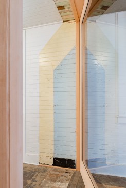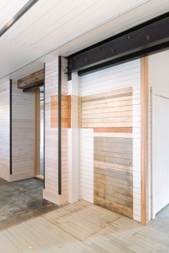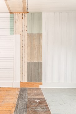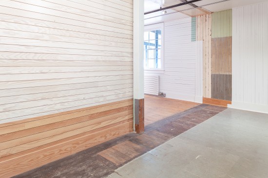The design team repurposed existing materials wherever possible to preserve historic character and visually tell the stories of the past. Flooring removed from the attic to create the double-height gallery was reused on the main level, while salvaged bead-board from the ceiling was patched into existing wall and ceiling surfaces, creating a conversation between materials throughout the space. The old-growth Douglas fir attic floor joists were carefully salvaged, cataloged, and milled into new stair treads and risers.