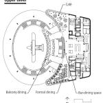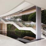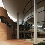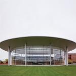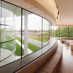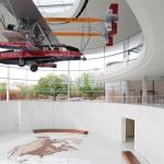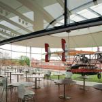 “What’s wonderful about [the plane] is that it’s a very fine-filigree piece of engineering,” says Giles Robinson, partner-in-charge on the project. “When we developed the structural system for Fortaleza Hall, it was very important that it be a very elegant and simple backdrop to the complexity of the plane.” But building a contemporary, minimalist structure on SC Johnson’s campus is a fraught proposition, given the iconic context. Fortaleza Hall, and the attached Commons building, sit between the Golden Rondelle (the company’s Lippincott & Margulies–designed pavilion for the 1964 New York World’s Fair) on one side and Frank Lloyd Wright’s iconic 1939 Administration Building and 1950 Research Tower on the other. “It’s a very fine balance—purely because every architect studies the Johnson Wax building—between wanting to do something that is contemporary, yet sensitive to that building,” Robinson says. “A lot of work goes into getting it right.”