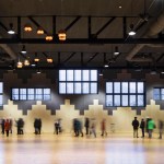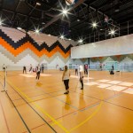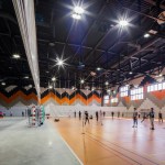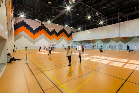 Inside the building, the spaces flexibility is maximal: two main adjustable subspaces have been created. The Great Hall (1.870 sqm), dedicated to host sport practice, competitions, shows, concerts or fairs, can be adapted thanks to a mobile bleacher and a set of retractable sliding partitions. The Festival Hall (870 sqm) also hosts shows and fairs, as well as associative events or banquets and weddings, thanks to a kitchen placed right next to it.