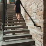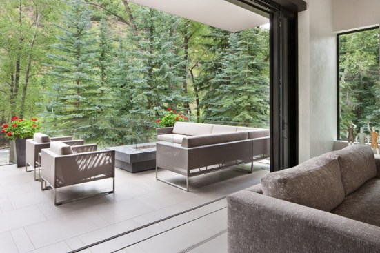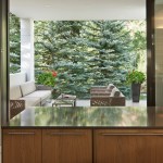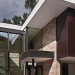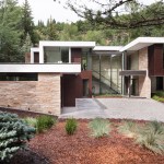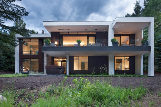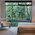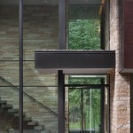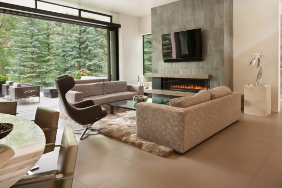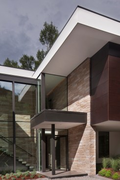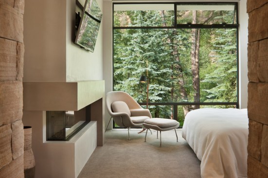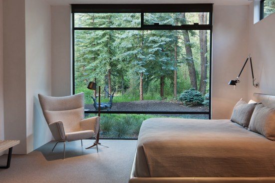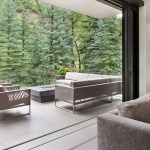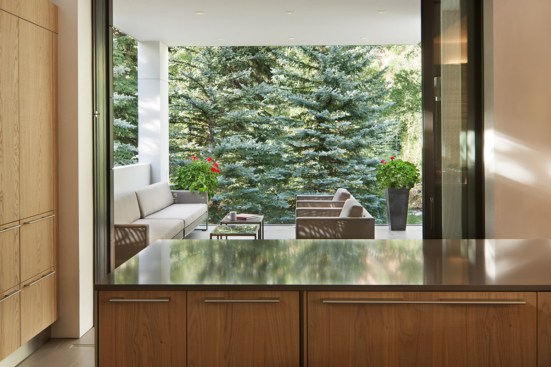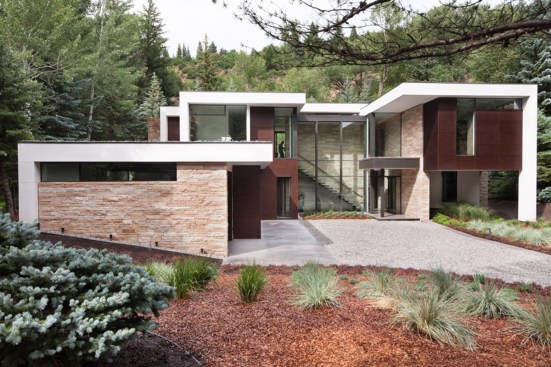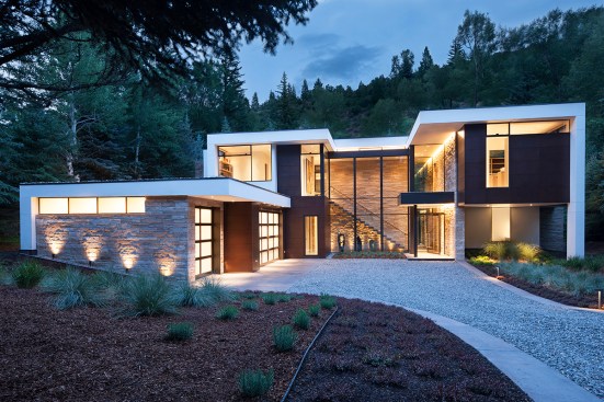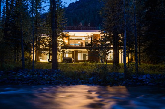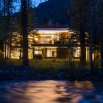 A sandstone wall parallels the Roaring Fork river, and seamlessly intersects the juxtaposing stone wall on opposite axis. No maintenance materials, bold forms of glass, stone, Resysta panels, and stucco form the exterior; allowing the sights and sounds of the river to be experienced from every room. Carefully placed operable clerestory windows allow for passive ventilation and solar gain.
