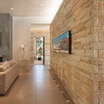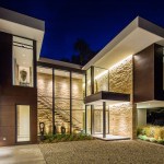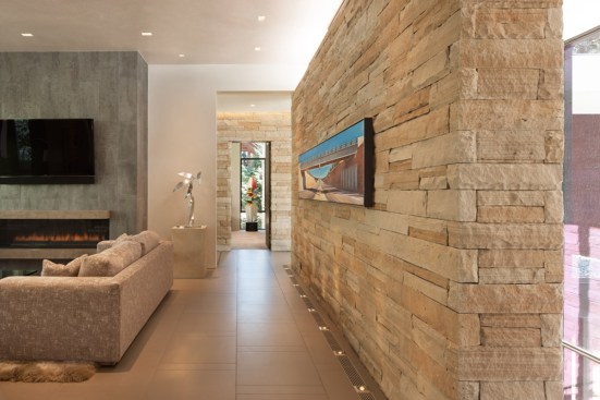The glass pivot entry door opens to a floating staircase flanked by one of the two sandstone walls, and a floor to ceiling window-wall. Stone intersects glass as it continues to the exterior. The living area opens completely via lift & slide doors to a 900 sf entertaining deck with glass railings. A six foot linear fireplace warms the space, while professional lighting harmoniously highlights the materials used throughout the design.