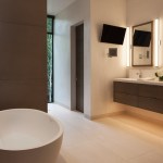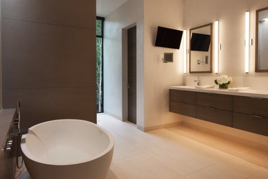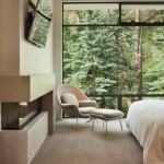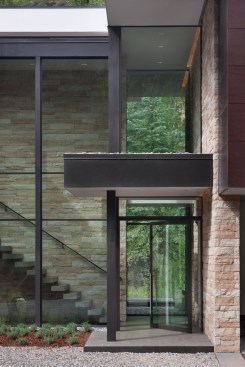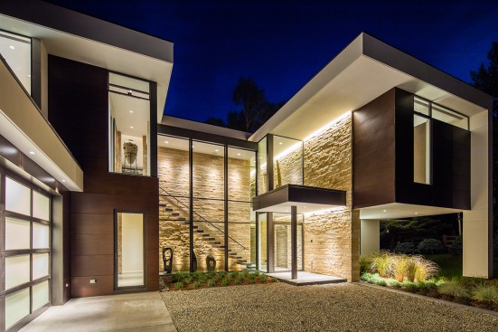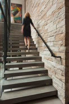 The master suite, with the stone wall extending through the glass, maintains the sleek palette with floor to ceiling windows and a linear fireplace. A floating tub with skylight above are the focal point in the master bath & adjacent wardrobe. Also on the upper level are the Owners’ office, powder room and pantry.