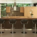 The custom Bulthaup kitchen includes a double island, generous storage, and a varied material palette, with a steel and wood-wrapped bar. Within the kitchen’s sandstone wall, lies a stainless steel inlay housing a Sub-Zero fridge/freezer, wine fridge, and roll-top door beverage center. Clerestory windows allow sun, ventilation and views.