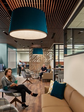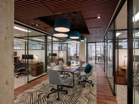 A guiding principle and inspiration behind the design, residential elements are layered into the office, providing employees with familiar comforts of home during their day-to-day at work. A variety of wood tones add warmth to the space and offset the industrial aesthetic of the exposed ceilings and concrete columns, creating a thoughtful balance between styles. A vibrant juxtaposition of materials, colors, and textures create unique moments throughout the office, lending to a softer, more inviting space that departs from the traditional law office ambiance.