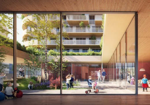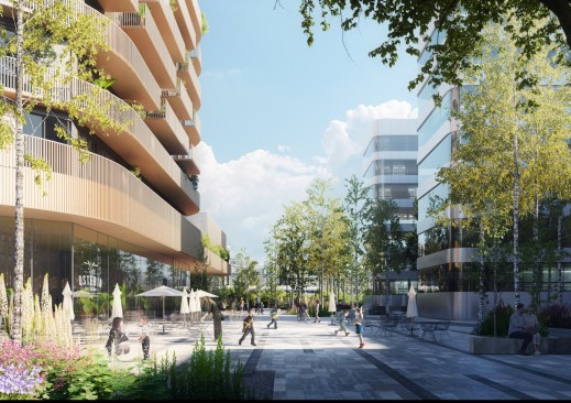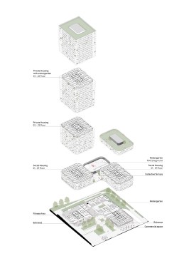 The two buildings are connected by a transparent plinth, which is enlivened by residential entrances and facilities, thereby also animating the surrounding public space. The 140-meter-high tower has a dynamic shape that seems to transform as you gaze upwards. As the tower rises, it widens, and the round corners gradually change into right angles.