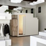 The innovative store interior has been outfitted with one of the firm’s iconic Super-Furnitures, a structure too small to be a building but too large to simply be a piece of furniture. The nine-piece, 28-foot-long modular staircase when assembled accommodates activities such as seating, a fashion runway or a performance stage. When disassembled, each one of the nine modules is designed to meet the needs of retail functionality, from product display to fitting rooms to storage and transactions.