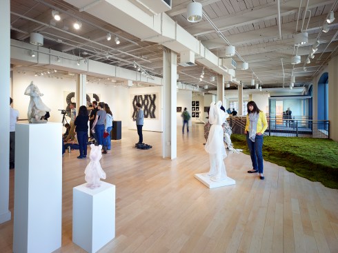 through large windows at the first floor lobby/gallery area and a glassy new