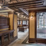 The scope of work for this most recent restoration was built on earlier projects and limited to the main spaces of the lowest two floors—the entry, billiard room, and children’s playroom on the ground level, and the living room and dining room on the second floor. A new front door with art glass has been fabricated according to Wright’s original design. Rich red magnesite floors on the ground level have been restored based on original materials—a magnified view revealed the presence of minuscule wood chips in the finish, an unexpected discovery that allowed for a precise match.
