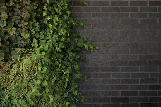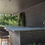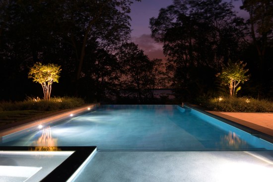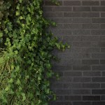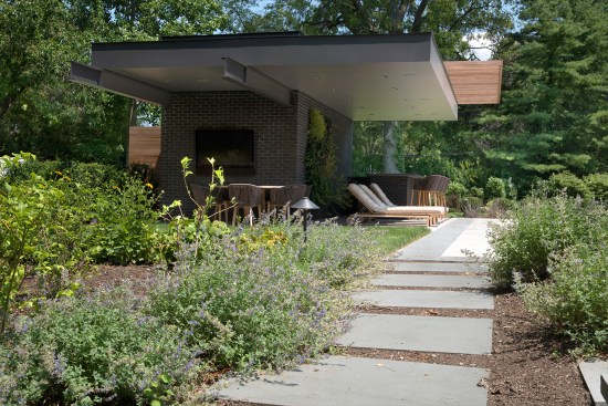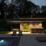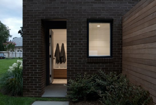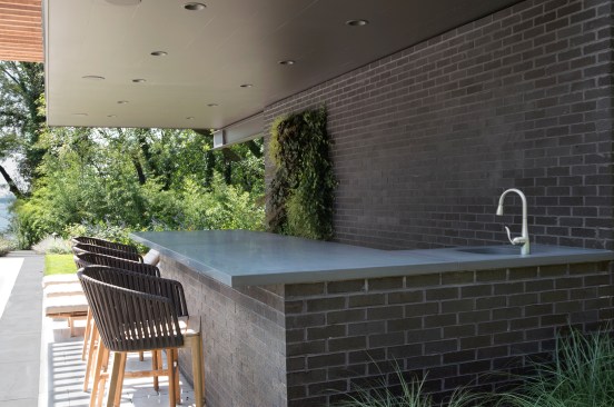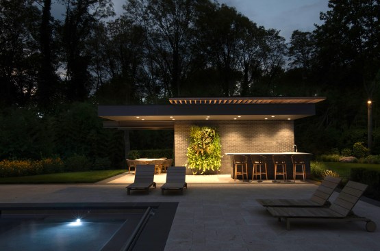 Black Belden brick contrasts with lush landscaping, including a green wall on the pool-facing façade of the structure. A delicate wooden trellis cantilevers off the roof covering, on axis with the path from the house, making a gentle connection back to the parent structure on the estate.