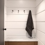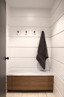 The cabana’s interior horizontal wallboards correspond to the exterior brick pattern. Each single board equals three brick courses. By eliminating any visible vertical joints, the boards create a simplified and clean interior aesthetic that relates to the brick facade yet providing a nice contrast to the brick’s natural textural element. The predominantly white interior helps keep the bath and changing room bright in contrast to the stone-wrapped walnut vanity and indoor / outdoor travertine floor.