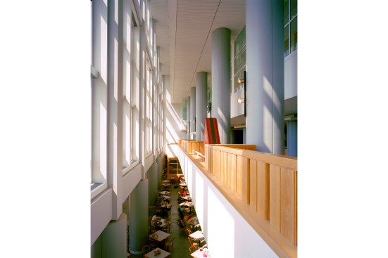 The design for the campus center is organized to reinforce these paths and establish the facility as a locus of activity along these routes — at once a destination and point of passage and casual interaction. The primary procession through the facility follows the terraced grading of the site. Visitors approaching from the north flow through a new arcade, designed as an extension of the existing building, into entries at Palmer’s lower level and move south through a series of “streets” lined with shops, student mail and information boards. At the end of these paths is a light-filled lounge overlooking an atrium with views opening out to the south. A generous flight of stairs leads further down to a dining room which opens south onto a terrace and lawn. Multiple entries are provided at this level for those approaching from the south.