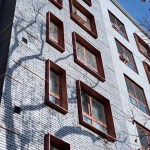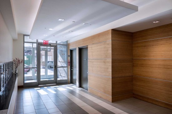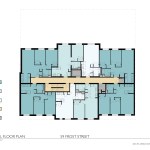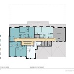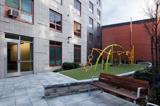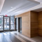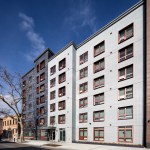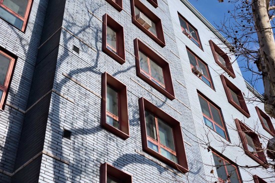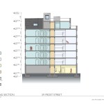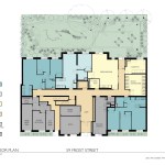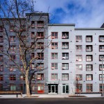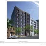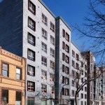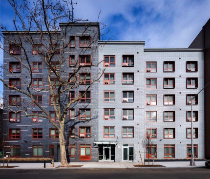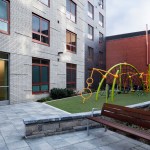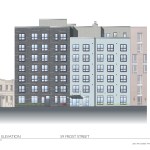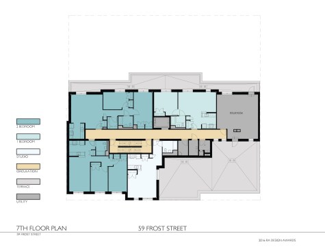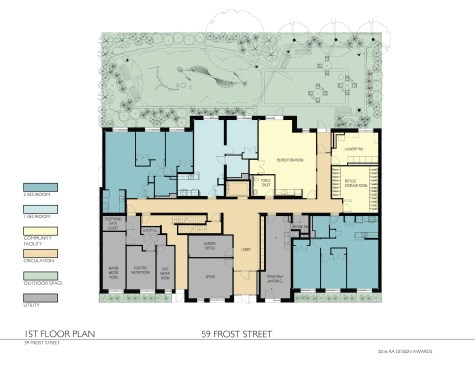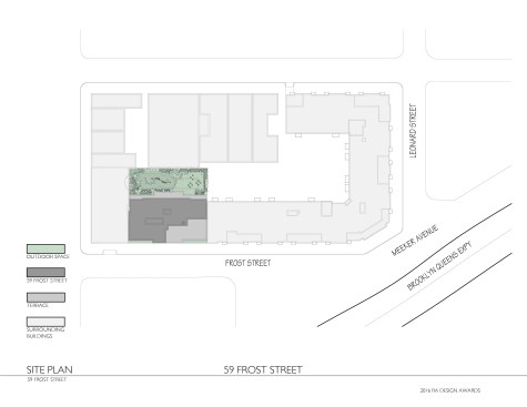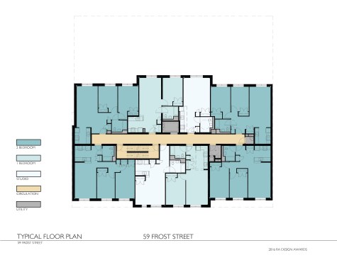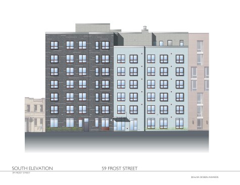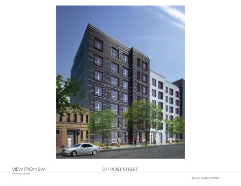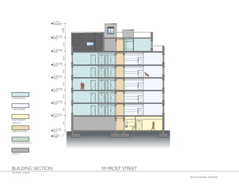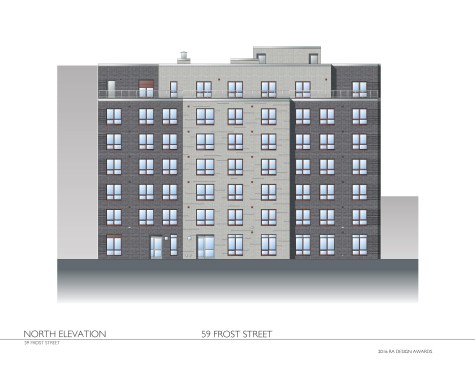 A great place to live in NYC that happens to be affordable Frost Street is a seven-story, 45,000 square foot low-income rental building in Williamsburg, Brooklyn with 47 units. Built through the Inclusionary Housing Program, Frost Street provides both quality and protection of income diversity in this rapidly changing neighborhood. The building is permanently affordable, energy efficient and provides significant amenities to the residents. The form and façade articulations are designed to fit into a streetscape that has a variety of scales. Situated within a diverse and changing neighborhood context that includes two story row houses and large apartment buildings, a central consideration was finding a way to modulate the scale of the building to fit into this diversity. This was achieved by punctuating the facade with setbacks along the street wall, along with projected window frames that extend past the masonry to create a varied play of light and shadow. Courses of linear cast stone are distributed in the brickwork to break up the overall mass and distinguish the face of the building. The top of the building terminates with a minimalistic metal cornice. Public areas such as the lobby are simple and elegant, employing high quality wood paneling and stone tile around the elevator. Amenities include a community room and laundry room that open onto a landscaped rear yard with play space for children and a sitting area and bike storage. All planting is adapted or native species. The site is adjacent to an elevated arterial highway (BQE) and particular consideration went into finding ways of dampening the sound of the nearby traffic. A combination of a heavy masonry and concrete structure with high performance windows effectively block this noise. The units themselves are light and well ventilated with wood floors and open kitchens that maximize the space. All units, including a live-in superintendent unit, are handicapped adaptable with 5% pre-adapted for accessibility. Due to the high water table and location within the 500 year flood zone, the building has no basement and MEP systems are located the on the first floor raised above sidewalk level. The construction system is plank on bearing wall Insulated Concrete Forms (ICF’s). The thermal advantages of ICF construction, along with other measures, creates an energy efficient building which complies with the New York State Energy Research and Development Authority (NYSERDA) Multifamily Partner’s Program, requiring the building use at least 15% less energy than baseline. The building also meets New York States Department of Housing and Community Renewal’s green design criteria. Sustainable features include: • Bearing walls built with ICFs to create a continuous thermal envelope and air sealing • Energy star or equivalent LED light fixtures and appliances • Unitized ventilation – venting each apartment separately to minimize potential noise and cooking odor transfer between apartments • High performance windows • Low flow water fixtures • High efficiency boilers • Cogeneration combined heat and electrical power system • Located within a ¼ mile of a subway stop • Trickle vents in the windows for supply of fresh air