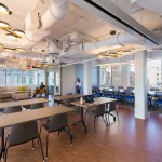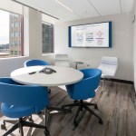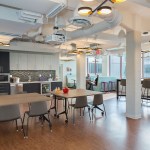 Fulcrum occupies 27,500 RSF on the 4th and 5th floors of the Jackson Building in MIT’s University Office Park. One of the design challenges was to take advantage of the unique geometry of the building – a “C”-shaped floor plan with no ninety-degree corners – and provide spaces that are open, light and conducive to collaboration. In addition, creating an efficient lab within a structural bay of 10’-0” x 14’-6” column spacing was a test of our creativity. AJB Lab Planning was instrumental in getting the optimum lab flow and incorporating all required equipment. The 4th floor, being the smaller suite, houses the main breakroom and meeting areas in addition to open and private offices. The break room incorporates a movable partition that enlarges the overall room for “all hands-on” meetings. The 5th floor has all the science spaces on one level, and includes four specialty tissue culture labs and robotics lab, along with reception, board room, executive, and general office space. The finishes were selected to create a warm and inviting environment with natural colors and textures that would be a counter point to the science spaces. The Fulcrum logo colors – primarily a blue palette – are incorporated in the furniture accent pieces throughout.
