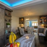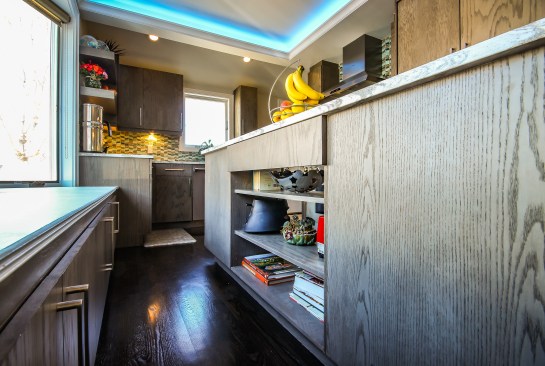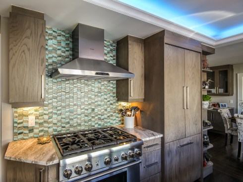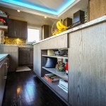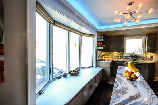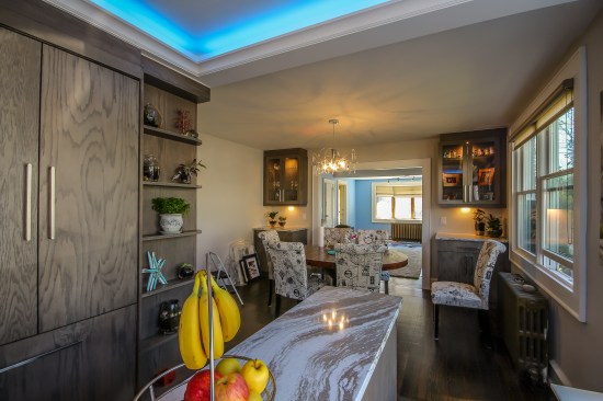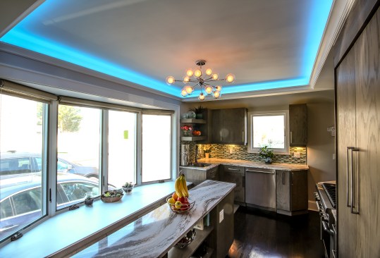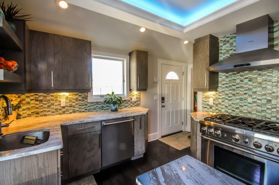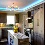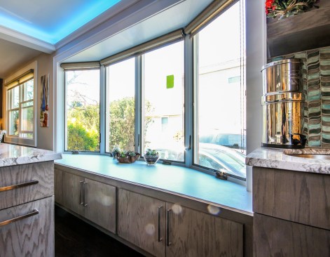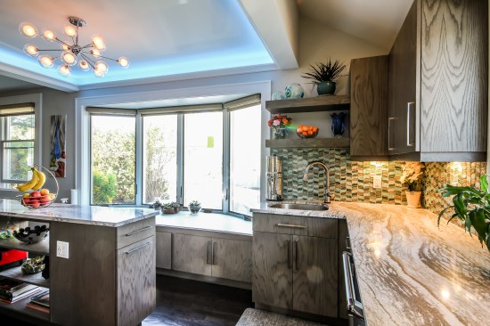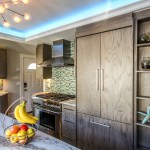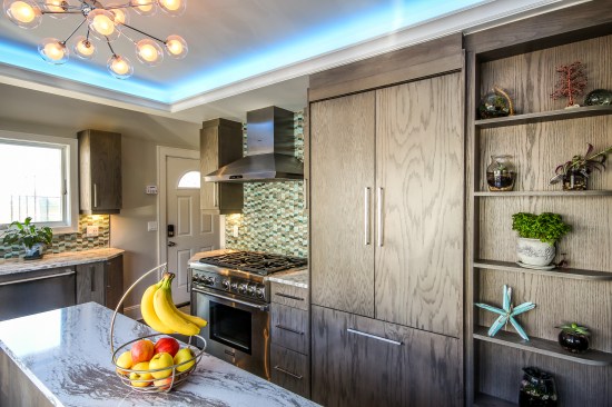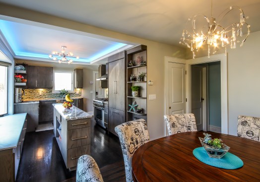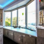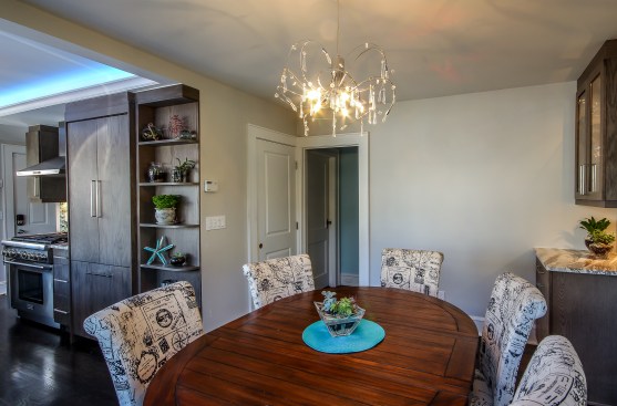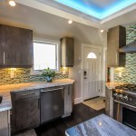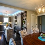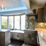 The homeowners occupy a 100 year old farmhouse that offered a unique solution to a personal and business need by enabling them to renovate, upgrade their kitchen space and provide a home studio for their on-line distribution business and internet blog. These entrepreneurs wanted a new kitchen that would function well for their family but with somewhat whimsical features, new appliances, extra storage and an island that would be their “video studio” for their blog. They did not want to increase the square footage or footprint of the house or kitchen, but would rather work inside the footprint of what was previously a barely functional environment. Their biggest requests were to keep a large bay window that provided a ton of natural light and they were insistent upon having an island. This family is very fond of Disney characters and their animated films. As travelers, they are specifically enamored with Disney World and wanted their kitchen to emulate a Disney World resort. In addition to functionality for their varied requirements, they wished to have visual entertainment in the form of color, texture and albeit subdued, a definite flavor for the colors and atmosphere one can find under the sea. Specialty lighting was considered for the seaside accents as well as specialty tile. The pattern for the counter tops was a blank canvas that could also be used to enhance the seaside theme and the cabinetry was an avenue to pursue as a focus for the colors and texture the homeowners wanted. Clearly from one look at the before photos, it supported that there would be some serious electrical work that need to be performed just to bring the house up to code and then some extras added on for the accent lighting that they were planning. The solutions to these problems were to upgrade the electrical panel to a 200 amp service, which would accommodate the new design and have extra room for the rest of the house. The new National Code “arc-fault” circuit protection was employed to ensure the home might last another 100 years. Task lighting, seemingly important to the business aspect of the blogging now done in the kitchen, these homeowners chose to use a sputnik style central pendant, which speaks to the illusion of the stars at night over the ocean. Additionally looking towards how to enhance the space and provide whimsy, a tray ceiling was conveniently an answer when outfitted with color changing LED light strips that can emulate a night sky, with otherwise no limit to the combinations possible. The real business end of the kitchen with a small work triangle is where they uncovered a vaulted porch ceiling which was enclosed at some point in a prior renovation. It was incorporated into the design adding vertical height to the far end of the room thus completing their functional whimsy. Seemingly original, but likely from a mid-century renovation, there were built in cabinets that long ago lost their functionality and appeal. However removing these cabinets exposed a brick structural feature that was ultimately decided would not change because it was part of the original construction of the house. To make this kitchen work with the now brick structure that stuck out like a sore thumb at the end of the kitchen, they added an open shelving unit in the same cabinet color and style, to tie the space perfectly together. Wanting an island was a game of inches but a necessity for this couple. The size of appliances and the fixed position of the walls left little room to design an island of any real size or significance. Instead the island, created cleverly with just enough space to accommodate the blog studio, is two drawer cabinets situated end to end with open shelving in-between. The counter tops for the island, as well as the other base cabinetry, is a quartz product chosen for its sand pattern. The cabinetry is an oak grain matte finish in a light brown color to simulate drift wood and is accentuated by the integrated panels used on the refrigerator. Using multicolored specialty glass tile, the back splash to the stove is a wavy design that brings to mind the aquamarine waves of a tropical paradise. The end result was a whimsy yet functional kitchen space that reflected the homeowners wants and needs perfectly.