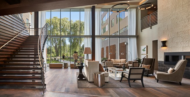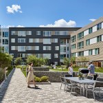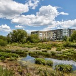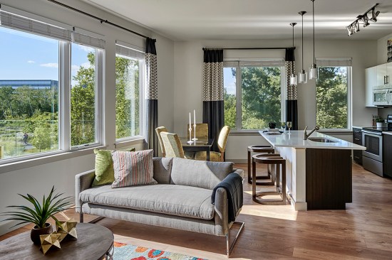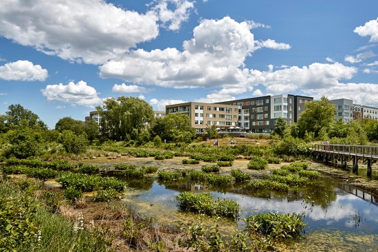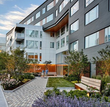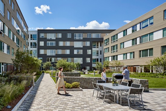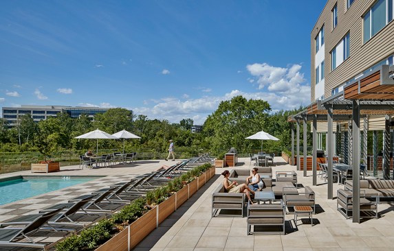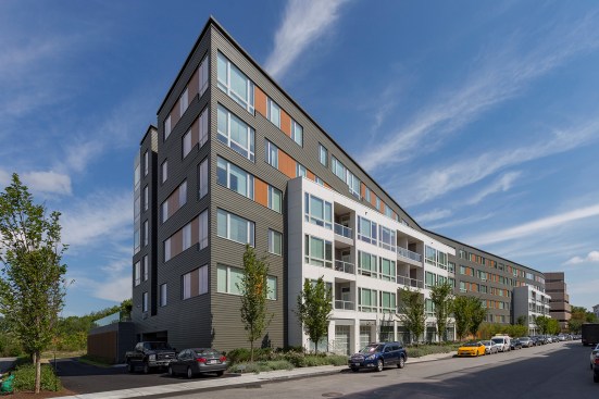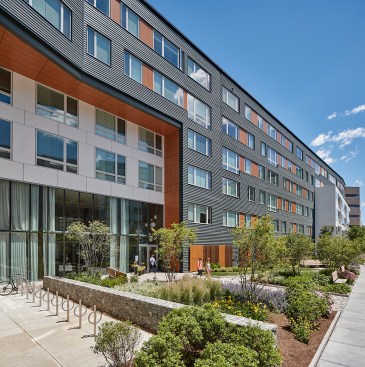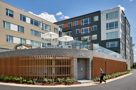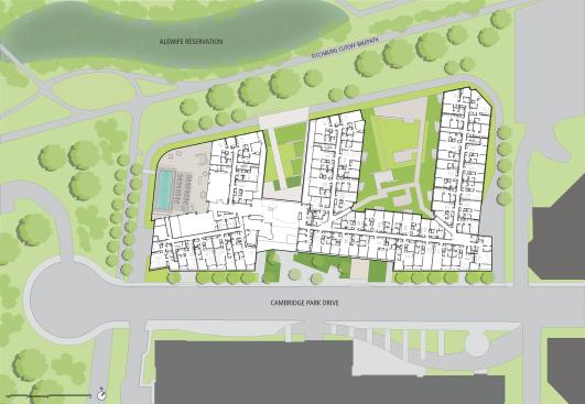 Fuse Cambridge adjoins the Alewife Reservation, a unique natural landscape in an urban setting situated near a mass transit hub and along an extensive network of bike and walking paths. The dominant building form bends gently away from the street edge, dramatizing the approach to the building and creating a dynamic entry courtyard. On the park side of the building, “fingers” reach out toward the reservation, while the raised landscaped courtyards in between draw the natural environment into the site. Unique to podium projects of this type, the parking level is divided to create a ground floor lobby and at-grade courtyard that provides dramatic visual connections to the reservation beyond. The project delivers amenities that accommodate modern, active lifestyles and offers the best of city living and access to a unique natural landscape.