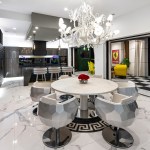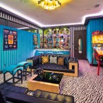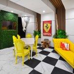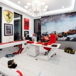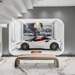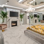 One of the main features you’ll notice is the Ferrari on display in the living room, but this home is one standout feature after the next. The theater/game room features turquoise tufted walls and zebra carpet with RBG LED lighting in the ceiling overhead. The primary bedroom has book match marble slabs on the fireplace wall and an Italian marble mantle. The bathroom has a floating bathtub illuminated by LED and titanium fire-glass. In the kitchen, you’ll find Valentino-inspired custom cabinetry and crystal chairs by Fendi Casa.