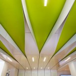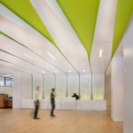 The dynamic twists and bends of the form recall the movement of paper through newspaper printing presses and the shifting lines of nearby railroad junctions. Made of powder-coated aluminum, the fins twist, converge, and are perforated to both reveal and conceal the green surface of the ceiling and wall behind. While this energetic form highlights the building entrance and lobby, the galleries that flank it on both sides are designed to disappear, fading into the background and allowing the artwork to speak. Pure white flexible galleries provide the open floor plan needed to exhibit a diverse range of work. The North Gallery moderates light through shading devices attached to the existing curtain wall, providing an ideal space for film, video, digital projection, installations, and other light sensitive artwork. Meanwhile, the South Gallery welcomes the light and the transparency in an effort to reveal the art within and engage the public with a visual presence on the street. The modulation of light throughout the spaces provides a full gradient of exhibition possibilities.