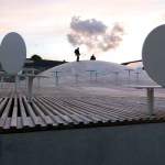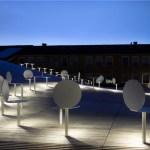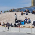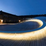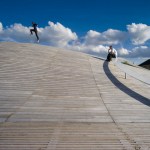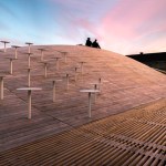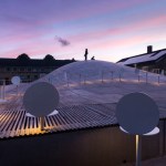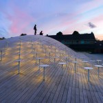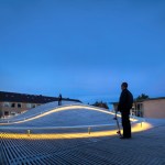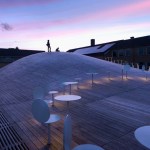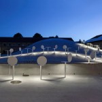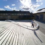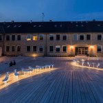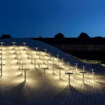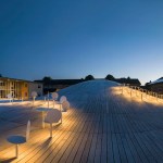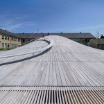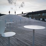 The exterior wooden decked surface consists of untreated oak wood and white enamel coated steel benches, also designed by BIG. The only light sources at night are the benches and BIG designed seating which are outfitted with tiny LED lights beneath lighting up the entire courtyard. The edge of the roof is designed as a long social bench, its lattice design ensures the penetration of daylight below. Solar panels placed strategically around the existing buildings provide heat for the hall.