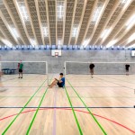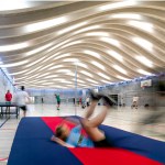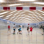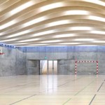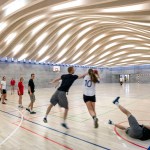 Bjarke Ingels: “Rather than placing the hall outside the school – and spread the social life further – we have created a new focal point and link between the school’s existing facilities. The roof forms a molehill that serves as a giant piece of informal furniture engaging and supporting student life. The main architectural idea emerged from the rules of handball as the soft curved roof takes its form from the mathematical equation of the trajectory of a thrown ball – Form follows Function. In an homage to my old math teacher, we used the mathematical formula for a ballistic arc to shape the geometry of the roof.”