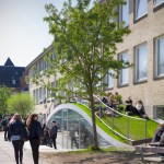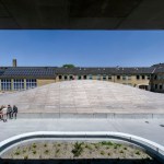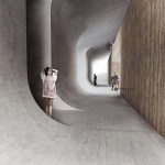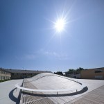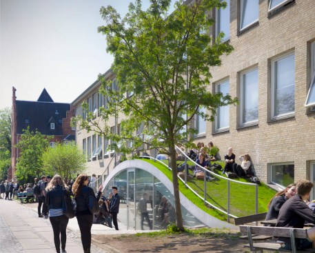 BIG conceived a large multifunctional space that could be used for sports, graduation ceremonies and social events.The new hall comprises a sunken 1,100 m2 space, placed five meters (16.5 feet) below the ground in the center of the school’s courtyard, ensuring a good indoor climate, low environmental impact and high architectural quality. The hall, formed by bevelled concrete walls, is covered by a soft vaulted wooden roof formed by a series of uniquely curved glued laminated timber beams. The roof, serving two functions as an interior and exterior skin, is a welcome addition to the existing 1950’s campus of yellow brick buildings. The hilly courtyard creates an informal meeting place that can host numerous activities from group work to larger gatherings.