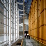The material properties of glass define the complex not only as a gentle reflection of the surrounding landscape, but also as an open, active community. The material palette further explores a wide range of textures, from rusticated fieldstone to polished stone and metal to warm wood and aluminium leaf.