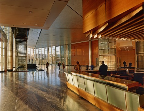The 30-acre site is located near Washington DC, and is developed as an amenity for its workers, with planted terraces and jogging and walking trails creating dynamic spaces for work and recreation. The form of the campus features two connecting wings that reach out in a welcoming gesture. Typical office spaces are located in the towers, and are flexible to allow for departmental change and reorganization. Common spaces are distributed along the entry level of the complex, with flexible, deep newsroom and production spaces in high-ceiling areas in podium levels 2 and 3. Employee amenities, including a cafeteria and fitness center, engage the landscaped setting.