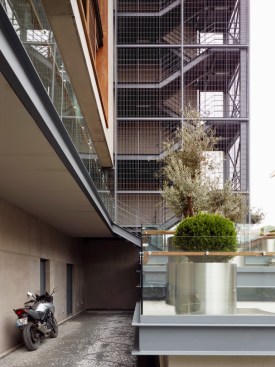 As a result of such restrictions, upper shell is hidden behind the roof parapet for the reason it had to be hip-roof. Side shell is fiber concrete and wood. Existing backyard is transformed into a social outer space and also is an end for the steel fire escape attached to the building.