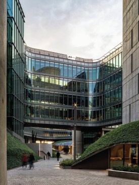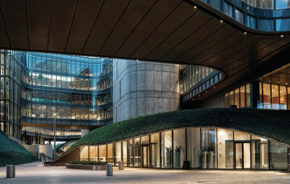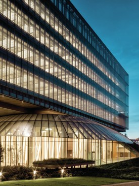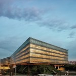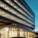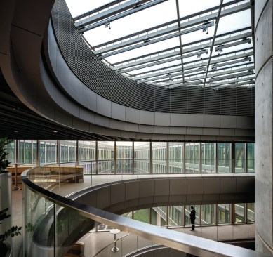 The widest cantilevering areas are supported by large composite beams placed on the roof. The four levels office block stands partially on a transfer structure to enable the widespan volume for the auditorium located within one of the hills.