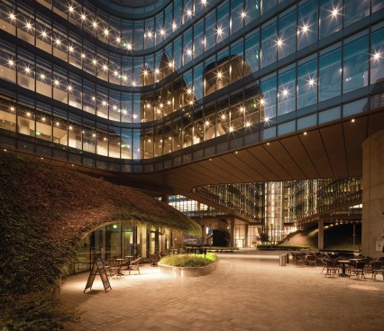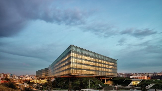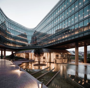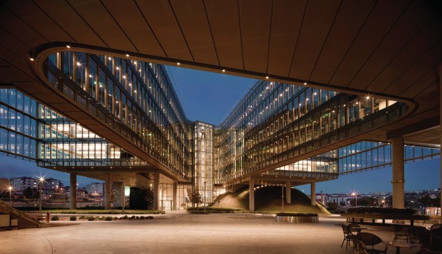The building implements the sustainability principles overall from single and double skin facade systems with dynamic sun shading integrated with lighting, to special heating & cooling systems providing the inner spaces with hundred percent fresh air. The facades have been designed as unitized systems allowing the high quality in terms of heat and acoustic insulation as the site is surrounded by highways with heavy traffic. During the initial stages of design when the site has been acquired, the old chemical factory has been removed. The soil has been checked further for contamination. The remainings has been dismantled into several different categories and has been sent for recycling and certified. The existing pine trees from the old factory has been kept and few displaced into newer locations within the site. The rain water harvesting is used for the landscape mainly. The green hills were obtained by a system of cables embedded into the sedum surface from top to bottom of the artificial hills. It is one of the largest green roof system applications in Turkey. The campus has received Leed Gold certificate.