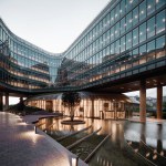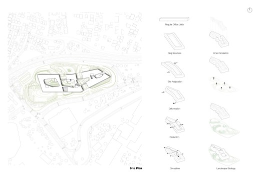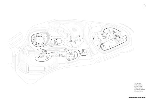Flexibility and maximizing the daylight being one of the major criteria for the working spaces, the accessibility to the office spaces has been organized through a set of elevated open courtyards where the users circulate and also have the ability to rest and socialize at lounges placed on bridges allowing many surprising views and vistas. The transparency is used to integrate the working spaces with the city, allowing the users to interact and to create different experiences throughout the year. A strong contrast awaits the user as the elevated horizontal crystal has a sharp and decisive cantilevered appearance from outside reflecting the sky, the landscape and the city yet the inner main axis structured with rather by voids. The user circulates through the outdoor ground levels following a path which undulates like a creek between the artificial hills. As with the ground outdoor levels, the elevated volume has been designed to allow an experience of journey for the every day user. Ponds are designed to enhance the cooling effect on the outdoors as well as on the glazed facades to reduce the temparature gain during hot seasons.
