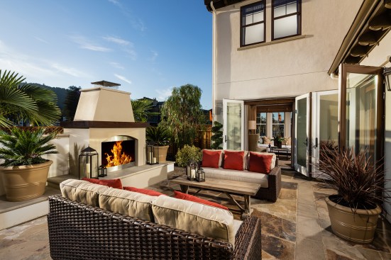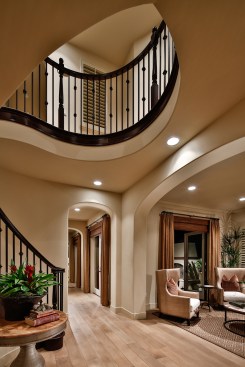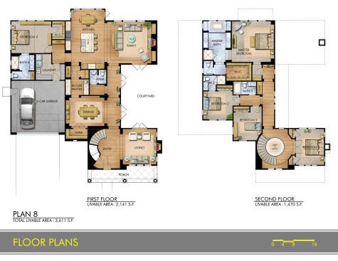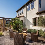 A wide front porch greets you to this traditionally-styled Spanish home, the largest home in the collection. Formal and informal gathering areas all face a courtyard with a cozy fireplace. A generous open plan kitchen, nook and family room open to rear yard. The junior master suite is tucked-in to complete the first floor. A grand circular staircase leads upstairs to a bonus room, two additional bedroom suites, and the master bedroom, which is located at the rear of the house for views to the oversized backyard and the creek corridor beyond.