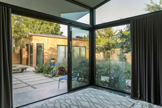 The Garden House is a radical remodel with new landscaping of a modest bungalow in the Atwater Village neighborhood of Los Angeles. The goal with this house was to open up the inside by breaking of a chunk of the volume and pulling it away. The existing single-car garage has been torn down and a newly oriented art studio/guest house is shifted to the back of the lot, creating opportunities for a variety of outdoor rooms and more fluid use of the entire lot.