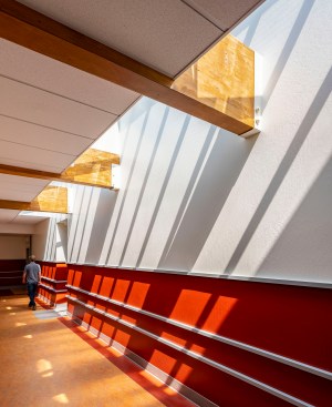 Sustainable strategies utilized throughout the school included efficient lighting, HVAC, plumbing fixtures, and non-toxic materials. Solatubes were used to bring daylight into select locations as well as existing and new skylights provided natural daylighting.