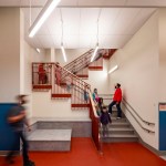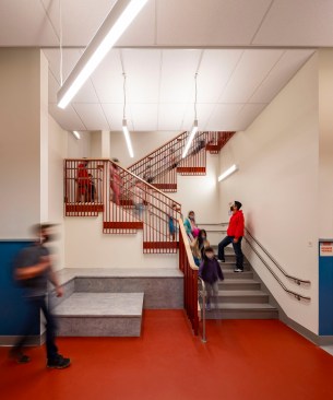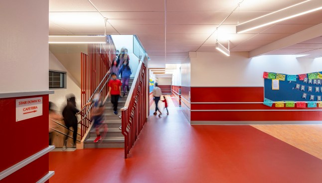 LDP worked with the San Francisco Unified School District to develop a plan that included a complete modernization. Scope included reconfiguring of interior spaces of the school, capturing additional area, and renovating the entire interior and exterior of the building and site. New designs responded to the school’s programmatic needs, creating corridors for acoustic separation of classrooms, adding a central stair that became the heart of circulation of the building, and a clear entrance to the site and building. Existing architectural features of the original design were preserved and highlighted, including skylights and exposed glu-laminated beams. Interior finishes included red colors for this Catonese Dual Language immersion school to symbolize success & happiness.